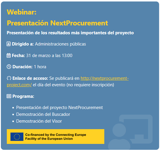 Para más información sobre este proyecto innovador, accede a la página de NextProcurement o participa en el webinar de presentación de esta iniciativa, que tendrá lugar el próximo día 31 de marzo a las 13:00h.